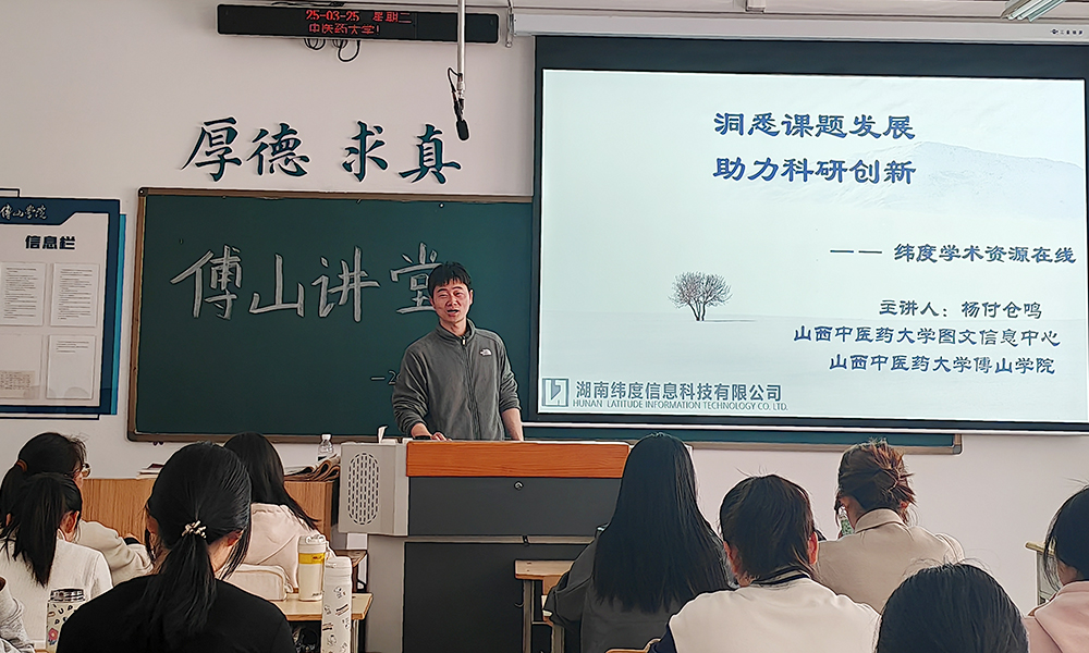 3月25日上午,三亿体育在图文信息中心906教室举办“傅山讲堂”系列学术讲座第七十二期。湖南纬度信息科技有限公司产品经理杨付仓鸣以《洞悉课题发展 助力科研创新——纬度学术资源在线数据库介绍》为题展开分享。