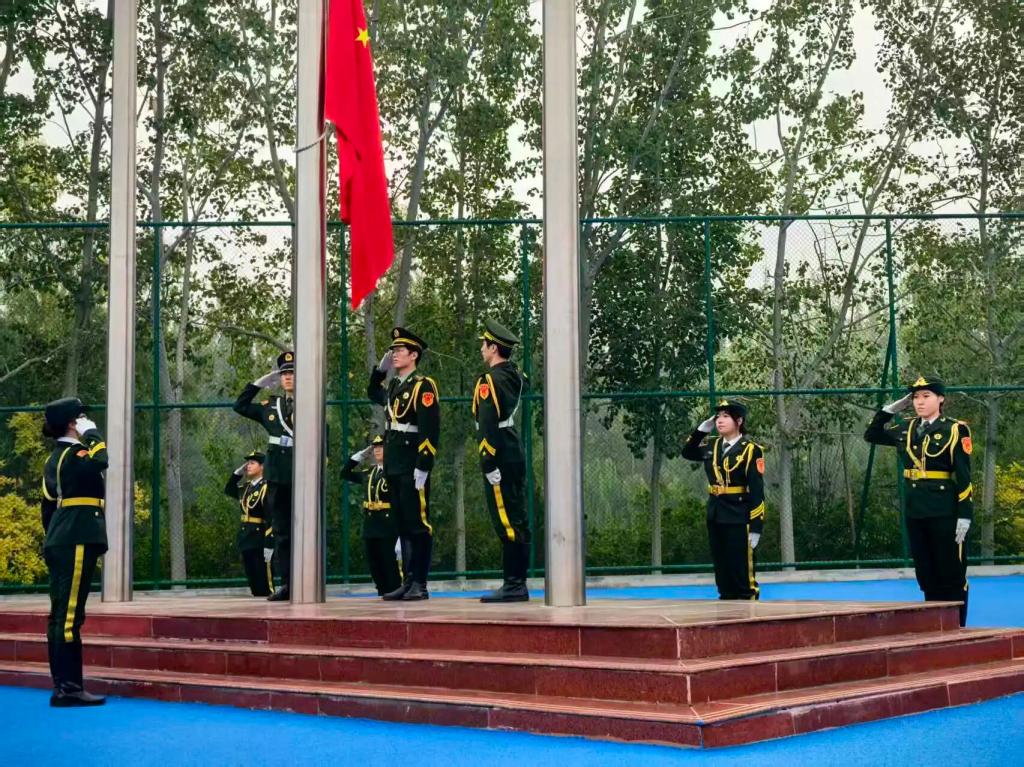 伴随着激昂的《义勇军进行曲》,五星红旗缓缓升空,全体师生肃立注目,向国旗行注目礼,爱国情怀在每个人心中激荡。